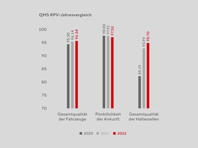 Kundinnen und Kunden sind mit der AB-Qualität zufrieden, was die standardisierten Zahlen gemäss QMS RPV-Erhebungen zeigen. Die Gesamtqualität im Zug und an der Haltestelle ist durchwegs gut. Sie konnte in den letzten Jahren noch gesteigert werden. Damit attestieren Kundinnen und Kunden den AB saubere und pünktlich verkehrende Züge mit einem guten Kundeninformationssystem. Von 1000 gefahrenen Zügen erreichten 975 Züge ihr Ziel mit einer Verspätung von weniger als drei Minuten.